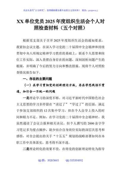 / XX单位党员2025年度组织生活会个人对照检查材料(五个对照)