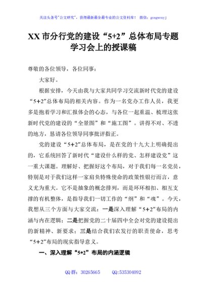 / XX市分行党的建设“5+2”总体布局专题学习会上的授课稿