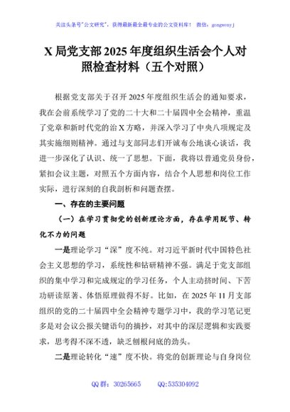 / X局党支部2025年度组织生活会个人对照检查材料(五个对照)