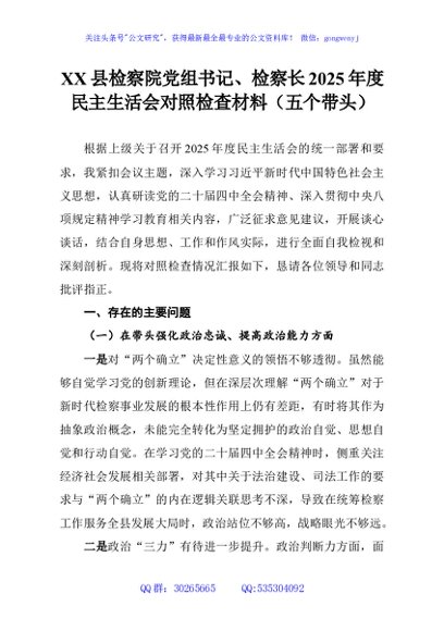 / XX县检察院党组书记、检察长2025年度民主生活会对照检查材料(五个带头)