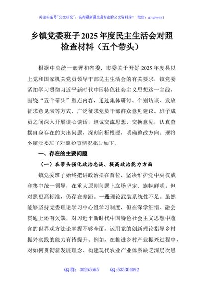 / 乡镇党委班子2025年度民主生活会对照检查材料(五个带头)