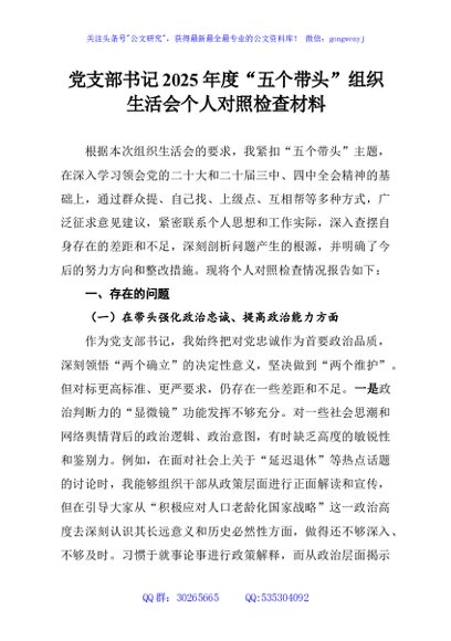 党支部书记2025年度“五个带头”组织生活会个人对照检查材料