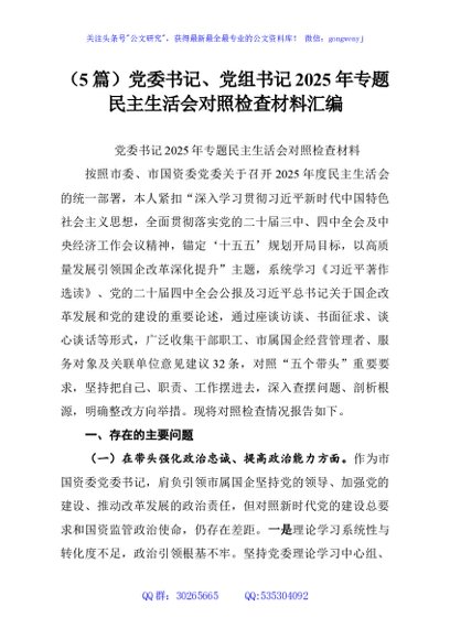/ (5篇)党委书记、党组书记2025年专题民主生活会对照检查材料汇编