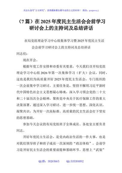 (7篇)在2025年度民主生活会会前学习研讨会上的主持词及总结讲话