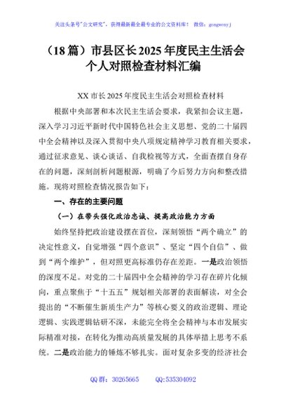 (18篇)市县区长2025年度民主生活会个人对照检查材料汇编