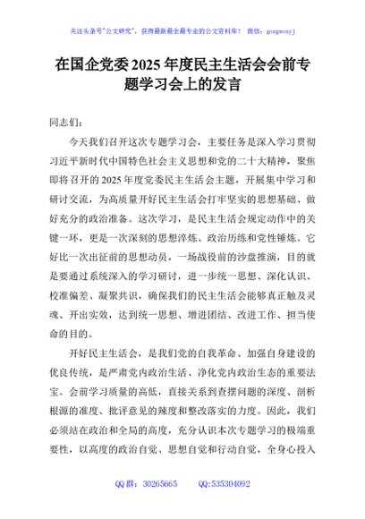 / 在国企党委2025年度民主生活会会前专题学习会上的发言