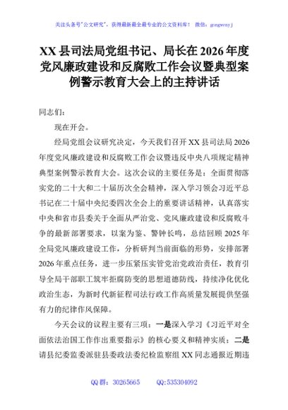 / XX县司法局党组书记、局长在2026年度党风廉政建设和反腐败工作会议暨典型案例警示教育大会上的主持讲话