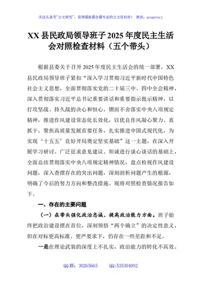 / XX县民政局领导班子2025年度民主生活会对照检查材料(五个带头)