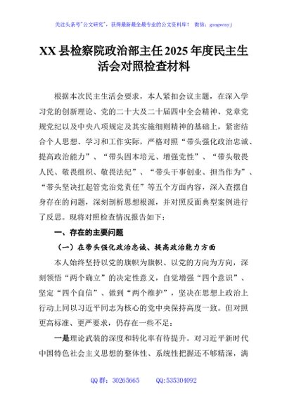 / XX县检察院政治部主任2025年度民主生活会对照检查材料