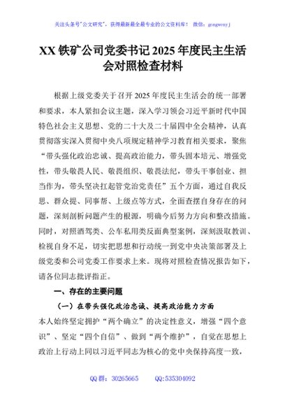 / XX铁矿公司党委书记2025年度民主生活会对照检查材料