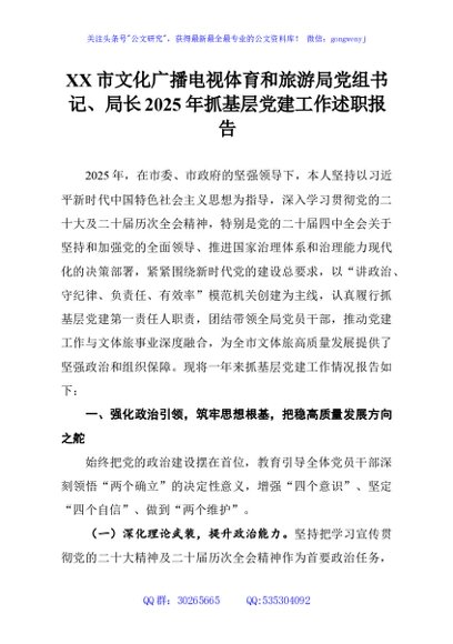 / XX市文化广播电视体育和旅游局党组书记、局长2025年抓基层党建工作述职报告