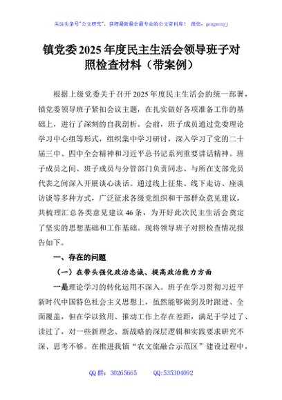/ 镇党委2025年度民主生活会领导班子对照检查材料(带案例)