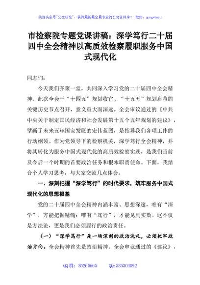 / 市检察院专题党课讲稿:深学笃行二十届四中全会精神以高质效检察履职服务中国式现代化