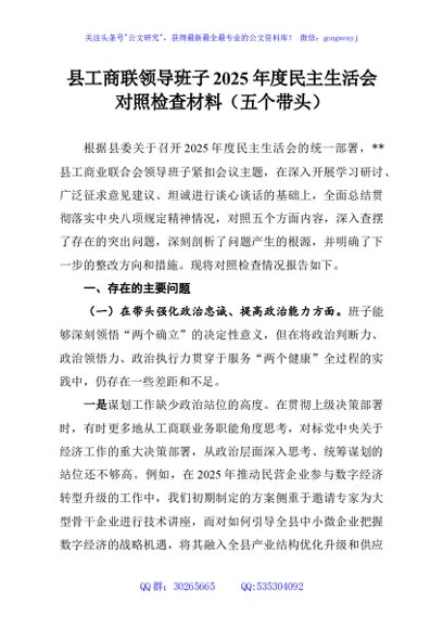 / 县工商联领导班子2025年度民主生活会对照检查材料(五个带头)