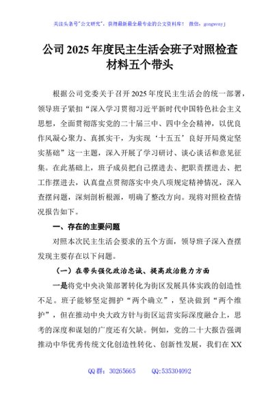 / 公司2025年度民主生活会班子对照检查材料五个带头