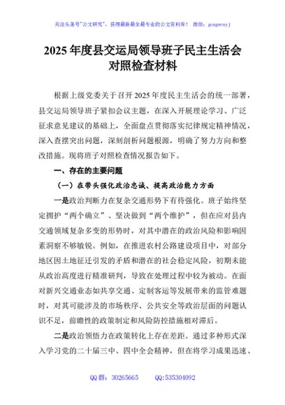 / 2025年度县交运局领导班子民主生活会对照检查材料