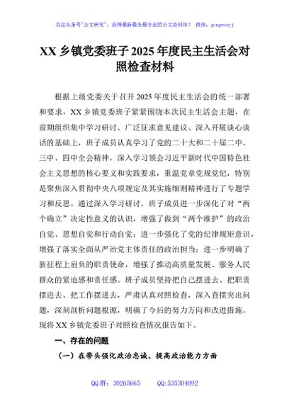 / XX乡镇党委班子2025年度民主生活会对照检查材料