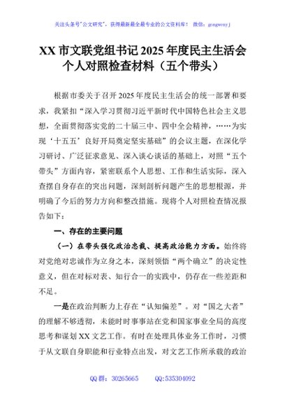 / XX市文联党组书记2025年度民主生活会个人对照检查材料(五个带头)