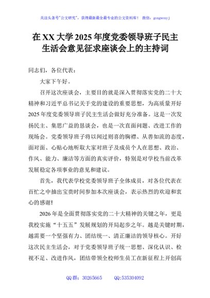 / 在XX大学2025年度党委领导班子民主生活会意见征求座谈会上的主持词