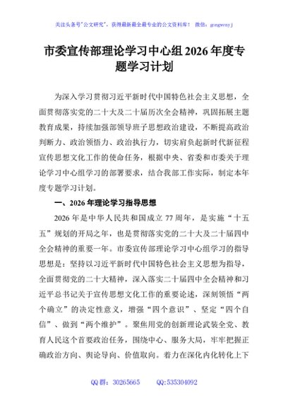 / 市委宣传部理论学习中心组2026年度专题学习计划