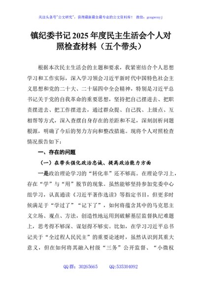 / 镇纪委书记2025年度民主生活会个人对照检查材料(五个带头)