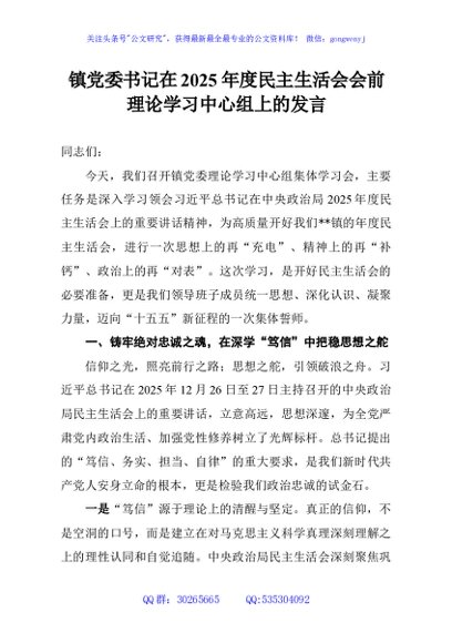 / 镇党委书记在2025年度民主生活会会前理论学习中心组上的发言