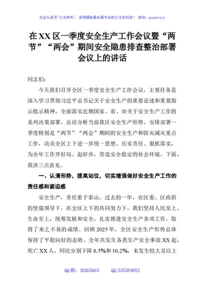 / 在XX区一季度安全生产工作会议暨“两节”“两会”期间安全隐患排查整治部署会议上的讲话