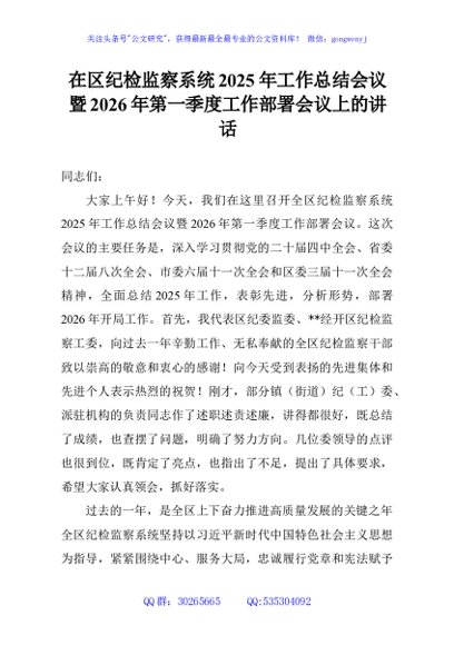 / 在区纪检监察系统2025年工作总结会议暨2026年第一季度工作部署会议上的讲话