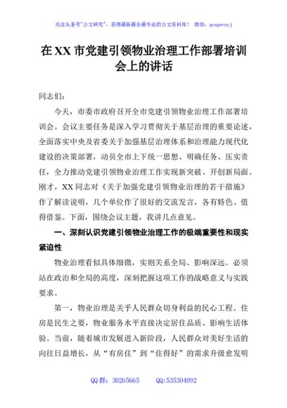 / 在XX市党建引领物业治理工作部署培训会上的讲话