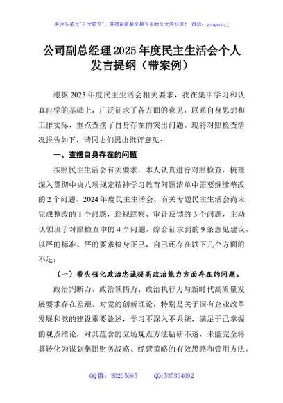 / 公司副总经理2025年度民主生活会个人发言提纲(带案例)