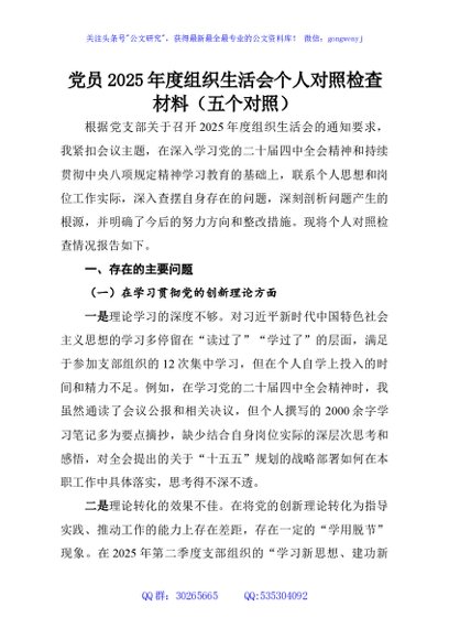 / 党员2025年度组织生活会个人对照检查材料(五个对照)