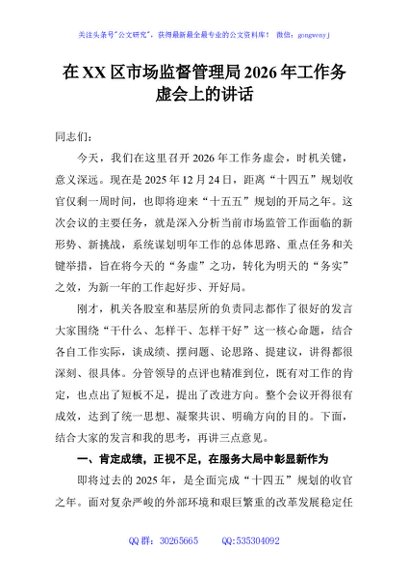 / 在XX区市场监督管理局2026年工作务虚会上的讲话