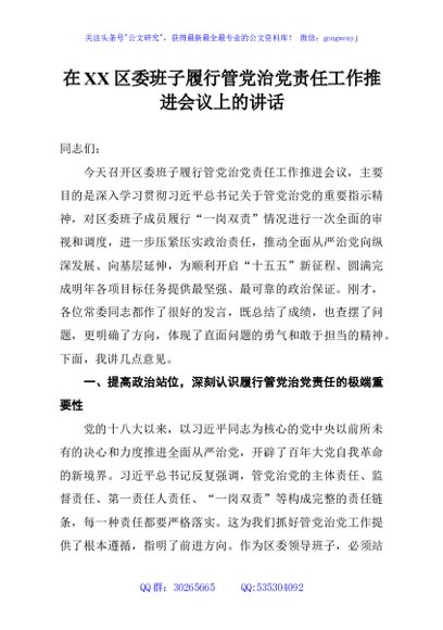/ 在XX区委班子履行管党治党责任工作推进会议上的讲话