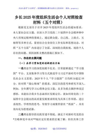 / 乡长2025年度组织生活会个人对照检查材料(五个对照)