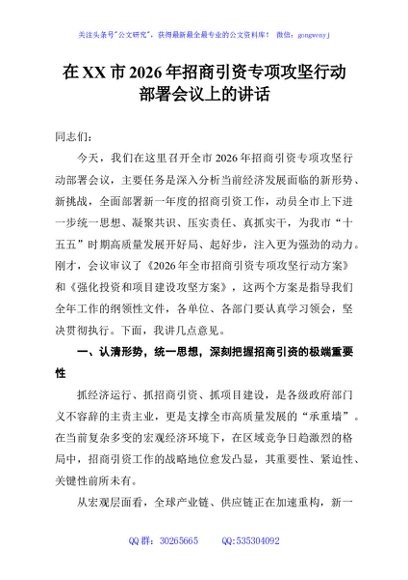 / 在XX市2026年招商引资专项攻坚行动部署会议上的讲话