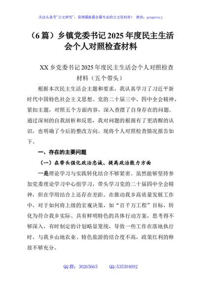 (6篇)乡镇党委书记2025年度民主生活会个人对照检查材料