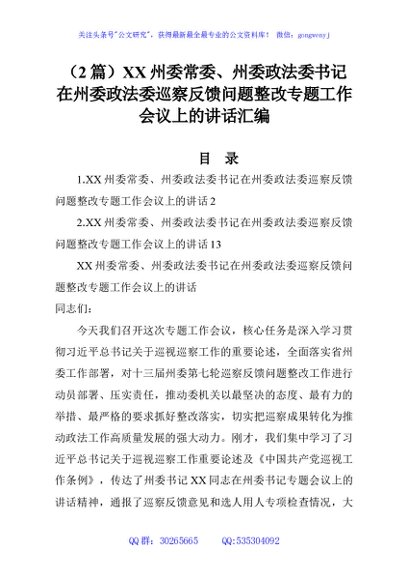 / (2篇)XX州委常委、州委政法委书记在州委政法委巡察反馈问题整改专题工作会议上的讲话汇编