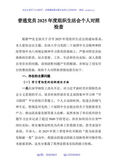 / 普通党员2025年度组织生活会个人对照检查