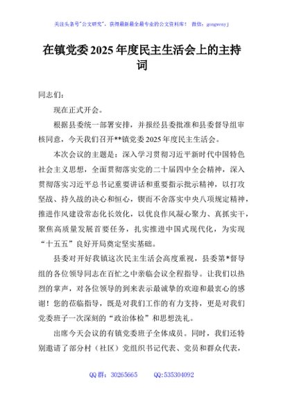 / 在镇党委2025年度民主生活会上的主持词