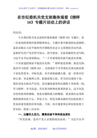 / 在市纪委机关党支部集体观看《榜样10》专题片活动上的讲话
