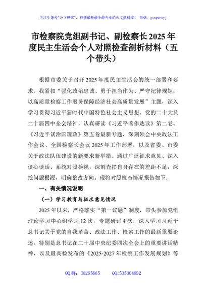 / 市检察院党组副书记、副检察长2025年度民主生活会个人对照检查剖析材料(五个带头)