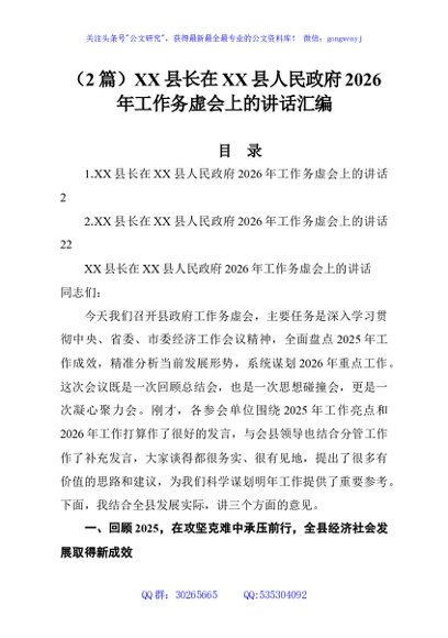 / (2篇)XX县长在XX县人民政府2026年工作务虚会上的讲话汇编