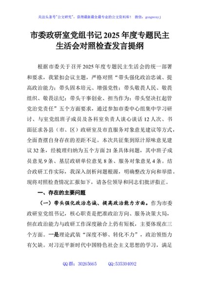 / 市委政研室党组书记2025年度专题民主生活会对照检查发言提纲