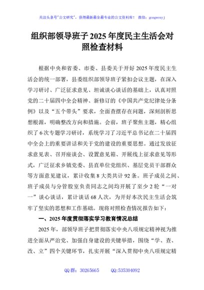 / 组织部领导班子2025年度民主生活会对照检查材料
