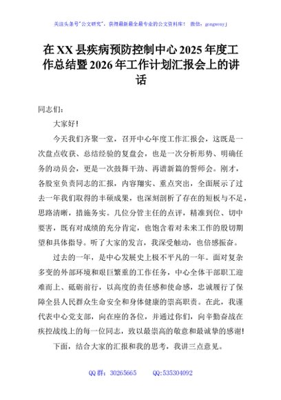 / 在XX县疾病预防控制中心2025年度工作总结暨2026年工作计划汇报会上的讲话