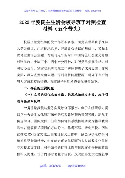 / 2025年度民主生活会领导班子对照检查材料(五个带头)