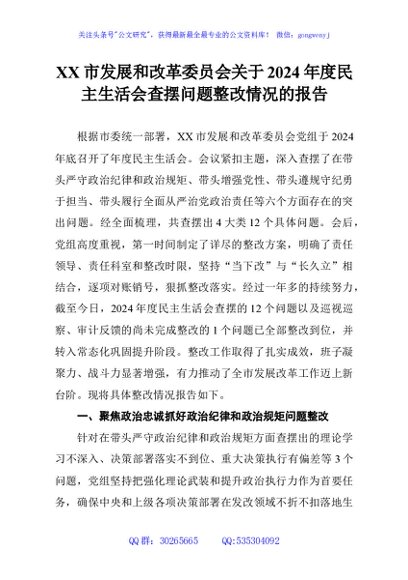 XX市发展和改革委员会关于2024年度民主生活会查摆问题整改情况的报告 - 公文研究