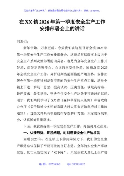 / 在XX镇2026年第一季度安全生产工作安排部署会上的讲话