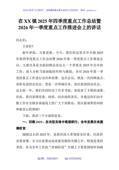 在XX镇2025年四季度重点工作总结暨2026年一季度重点工作推进会上的讲话 - 公文研究