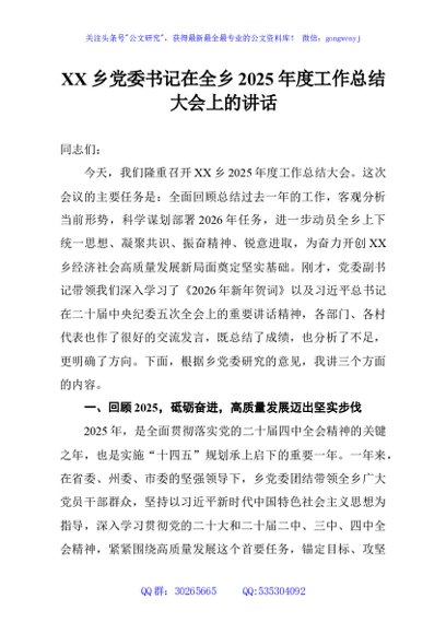 未生成预览图,长按二维码添加 XX乡党委书记在全乡2025年度工作总结大会上的讲话 - 公文研究